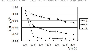 圖2 比較(圖2)中的三條凈化效率曲線可以看出,在相同的測(cè)試條件下,使用相同的技術(shù),但是凈化效率卻有很大差異,2號(hào)產(chǎn)品能使甲醛濃度迅速下降,1h內(nèi)即達(dá)到0.1mg/m3以下,可是1號(hào)產(chǎn)品在開啟3h后,甲醛濃度依舊在0.7mg/m3以上。許多研究表明,光催化可以在常溫常壓下即可將空氣中的有害氣體分解成無毒物質(zhì)[7],而且沒有二次污染,是一種有效的去除各種室內(nèi)污染物的先進(jìn)技術(shù),但在我們測(cè)試的同時(shí)檢測(cè)環(huán)境艙內(nèi)的臭氧濃度,發(fā)現(xiàn)臭氧濃度在光催化技術(shù)的凈化器凈化過程中均有不同程度的升高。這說明在考慮選擇光催化凈化產(chǎn)品的同時(shí),不應(yīng)該忽視其副產(chǎn)物臭氧的存在。另外光催化產(chǎn)品還存在催化劑失活的現(xiàn)象。催化失活是指催化劑表面被反應(yīng)產(chǎn)物或顆粒物覆蓋,失去催化效果,必須及時(shí)更換核心部件。因此如何選擇副產(chǎn)物的生成量較小,并且壽命較長(zhǎng)的催化產(chǎn)品是催化劑類凈化器選型的關(guān)鍵。同一臺(tái)凈化機(jī)改進(jìn)前后凈化效率的比較 由于同種技術(shù)的凈化效果會(huì)因?yàn)樵O(shè)計(jì)工藝或者制造技術(shù)的不同形成較大差異,所以很多凈化器廠家也在不停的改進(jìn)生產(chǎn),希望可以得到效果好、副產(chǎn)物少、壽命長(zhǎng)的產(chǎn)品。圖3中表示的是一家使用復(fù)合式技術(shù)廠家生產(chǎn)的凈化產(chǎn)品,主要采用的技術(shù)有過濾、吸附、高壓靜電和負(fù)離子,(圖1、2、3)中曲線分別是同一臺(tái)凈化器未經(jīng)過改進(jìn)和兩次改進(jìn)后得到的凈化效率曲線,三次試驗(yàn)時(shí)凈化器內(nèi)部結(jié)構(gòu)基本相同,只是在關(guān)鍵技術(shù)處做出調(diào)整,測(cè)試時(shí)得出的凈化效率有明顯差異。從圖中可以清晰的看出,三條凈化效率曲線明顯由低到高,說明關(guān)鍵技術(shù)的調(diào)試對(duì)凈化器的凈化效率有顯著影響。